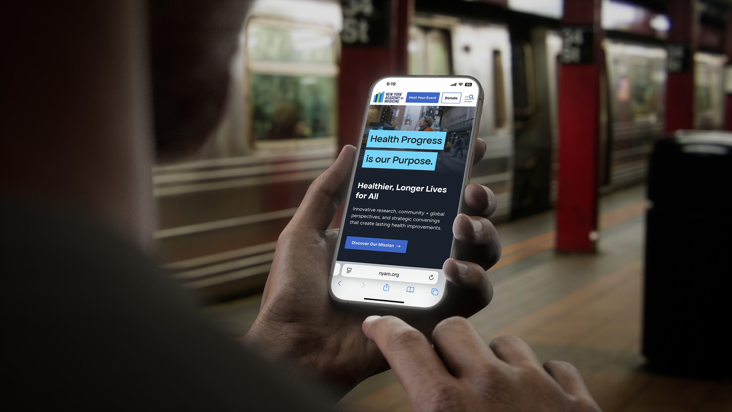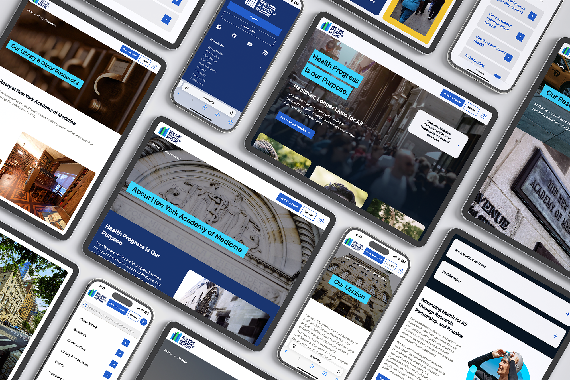 NYAM came to us with rich research and a new strategic positioning centered on health progress. We used those insights as our foundation, building a visual identity around the intersection of people and data, showing how evidence, community, and collaboration move health forward.